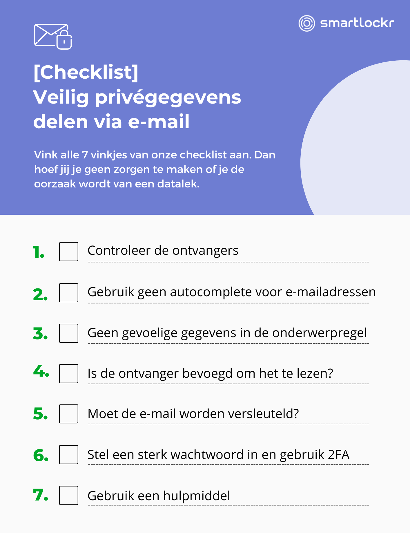Het lijkt misschien veel om al deze regels te volgen. Als je er echt zeker van wilt zijn dat je privégegevens verzendt zoals het hoort, dan is Smartlockr misschien de perfecte tool voor je. Wij controleren de ontvangers en beveiligen e-mails en bijlagen automatisch. En natuurlijk is alles ook nog eens versleuteld.